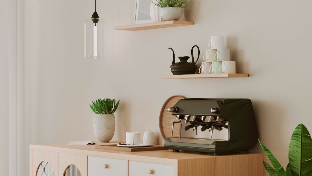 Full counter run (6+ feet of open counter space). This is the most forgiving setup. Spread your brewer, grinder, and supplies across a dedicated section of counter, with open shelving above for mugs and a decorative tray below to define the station’s footprint.