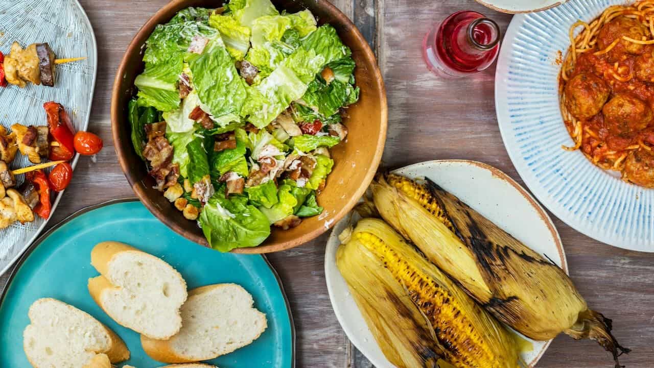 A simple green salad dressed with extra-virgin olive oil and balsamic vinegar works alongside grilled meats, seafood, pasta, and vegetarian dishes without competing for attention. Crusty bread and a seasonal fruit platter round out the table. These three items serve as a flexible base you can pair with any main course all summer long.